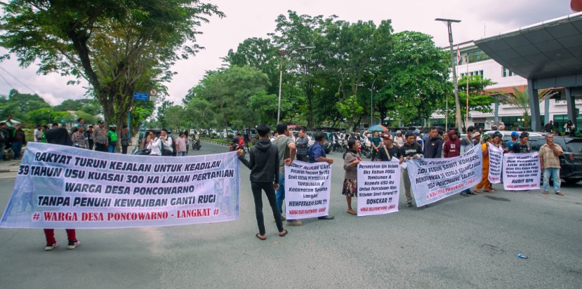 Puluhan warga Desa Poncowarno menuntut Universitas Sumatera Utara (USU) segera membayarkan hak masyarakat atas lahan yang telah digunakan selama 39 tahun.