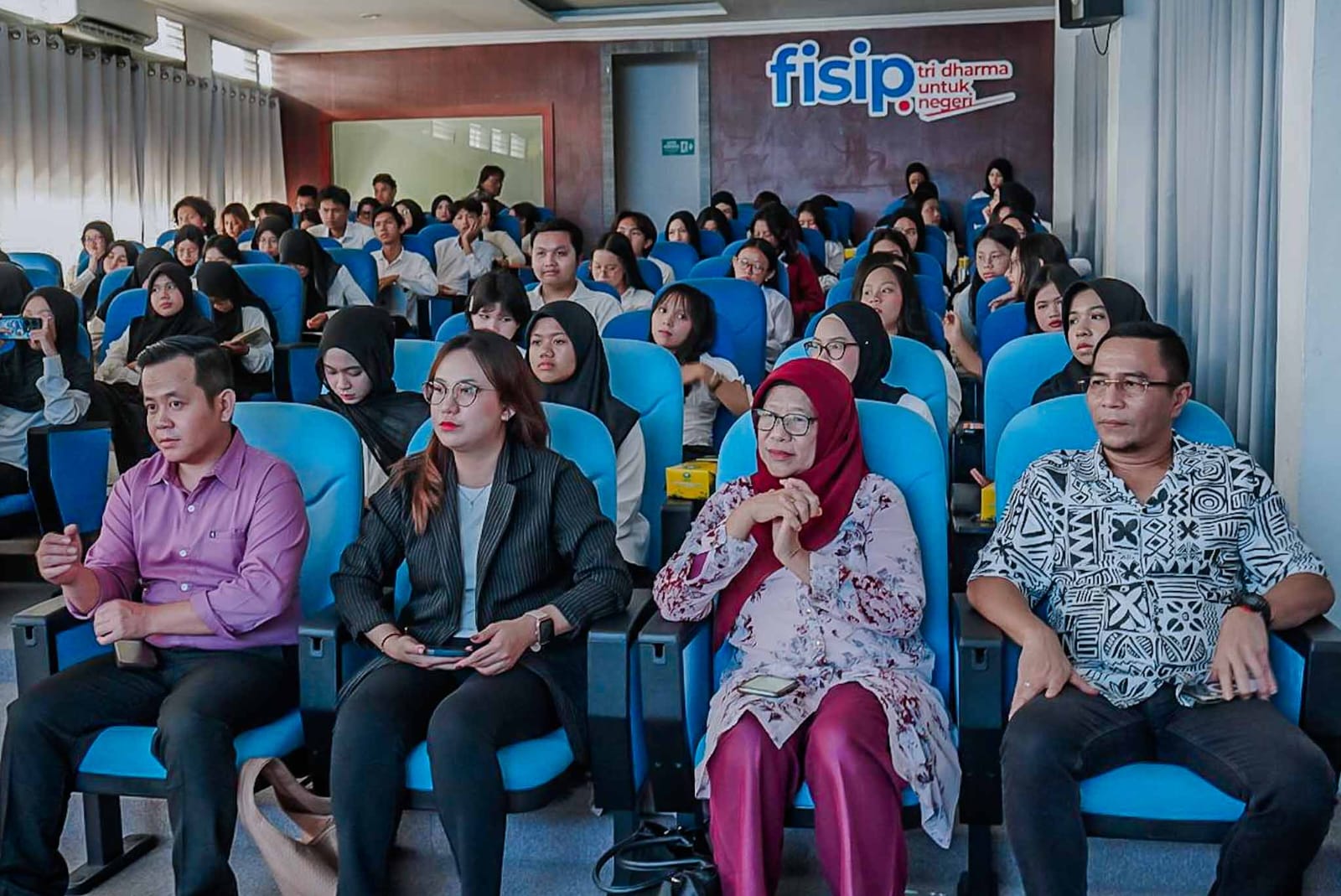 Seluruh kursi terisi penuh, sementara mahasiswa tampak aktif mengikuti materi dan berdiskusi dengan narasumber.