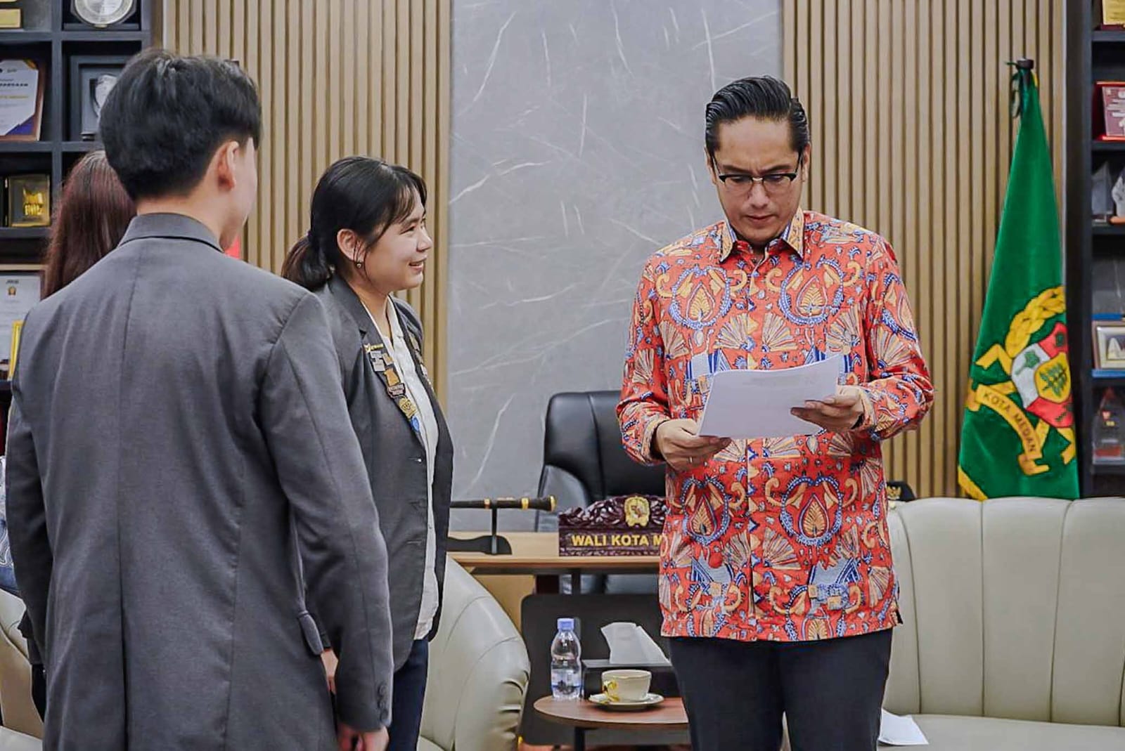 Wali Kota Medan, Rico Tri Putra Bayu Waas, menerima audiensi Badan Eksekutif Mahasiswa (BEM) Universitas Pelita Harapan di Rumah Dinas Wali Kota Medan, Jumat (17/4/2026).