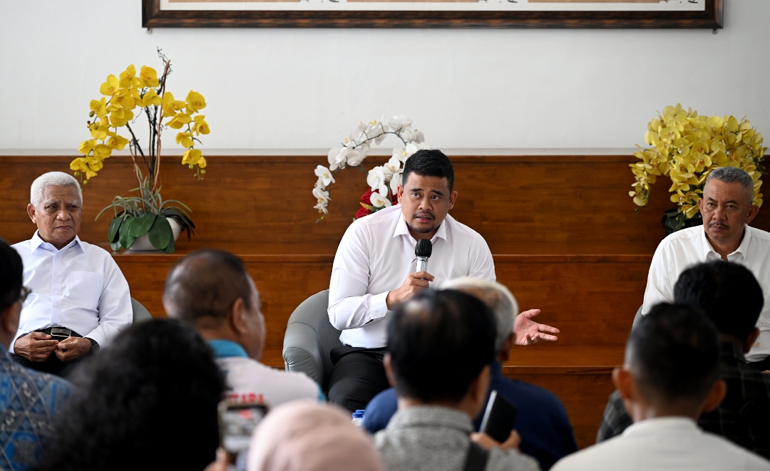 Gubernur Sumatera Utara Muhammad Bobby Afif Nasution didampingi Wakil Gubernur Sumut Surya dan Pj Sekretaris Daerah Provinsi Sumut Sulaiman Harahap saat temu pers