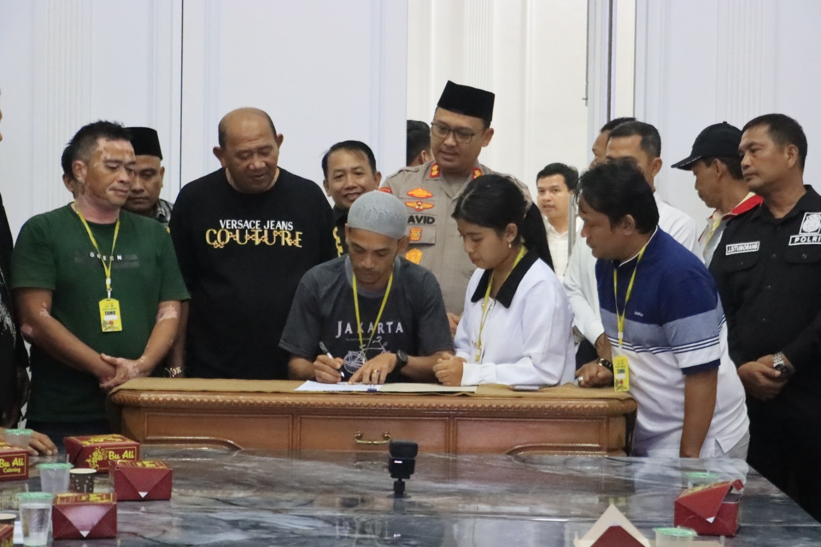 Proses dialog yang berlangsung intens akhirnya membuahkan hasil. Kedua belah pihak sepakat mengakhiri perselisihan secara damai dan menandatangani berita acara kesepakatan bersama. Dalam kesepakatan tersebut, mereka sepakat saling memaafkan, tidak memperpanjang persoalan, serta berkomitmen menjaga situasi keamanan dan ketertiban masyarakat (kamtibmas) di Kabupaten Langkat.