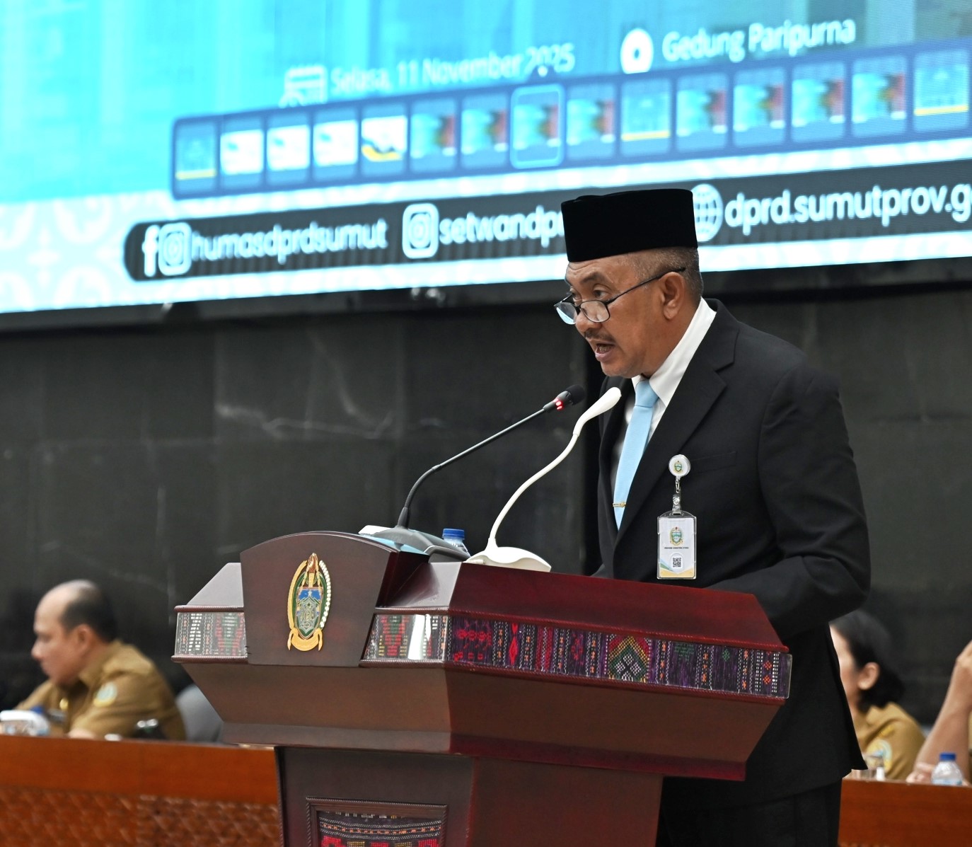 Penjabat (Pj) Sekretaris Daerah Provinsi Sumatera Utara (Sumut) Sulaiman Harahap mewakili Gubernur Sumut Muhammad Bobby Afif Nasution, membacakan Tanggapan atau Jawaban Gubernur Sumut terhadap Pemandangan Umum Fraksi DPRD Provinsi Sumut atas Ranperda tentang APBD Provinsi Sumut Tahun Anggaran 2026 di Ruang Sidang Paripurna DPRD Provinsi Sumut Jalan Imam Bonjol Nomor 5 Medan, Selasa (11/11/2025).