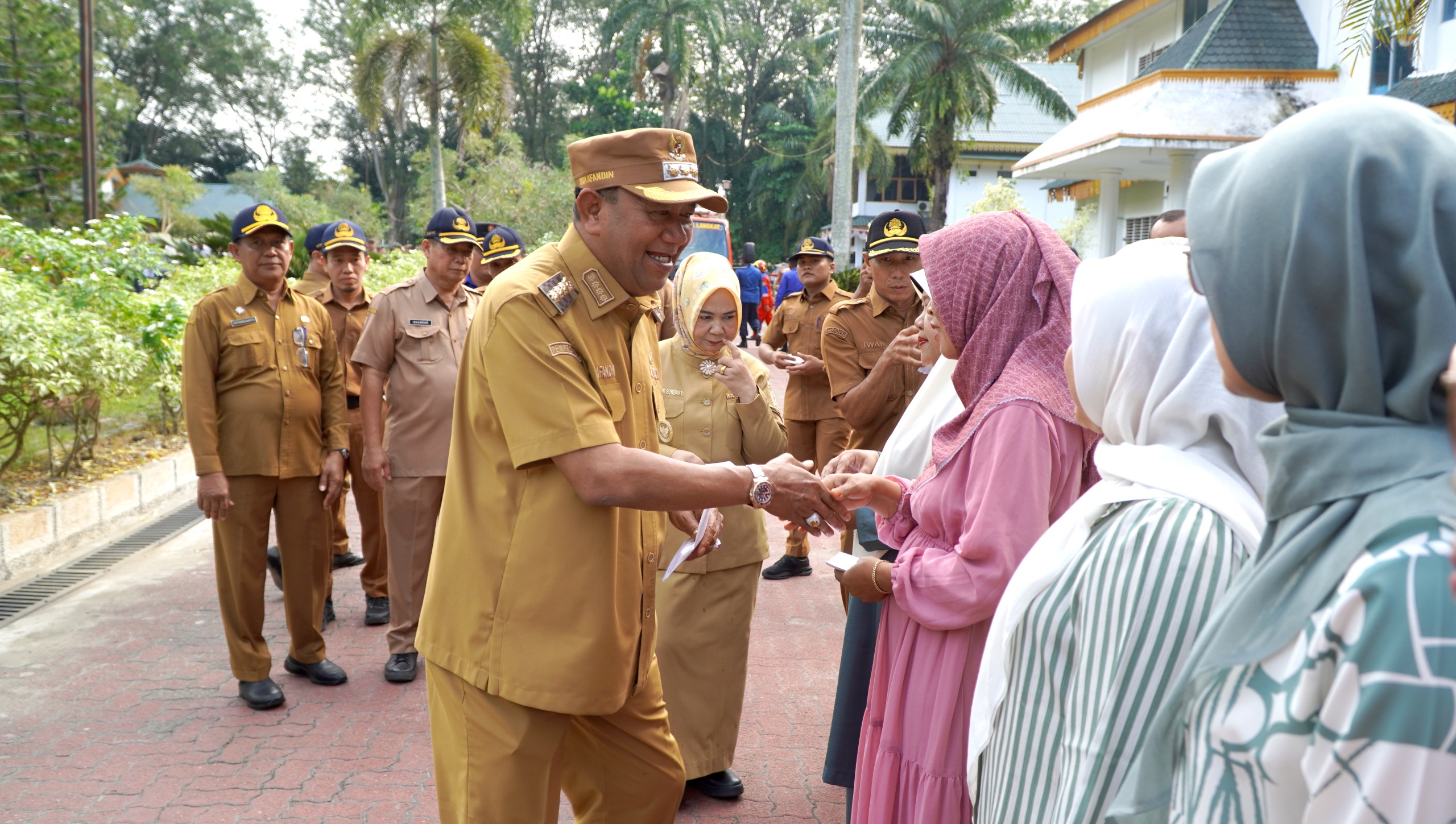 Bupati Langkat H. Syah Afandin, SH memimpin Apel Gabungan Pemerintah Kabupaten Langkat yang dirangkaikan dengan penyerahan santunan kepada 46 ahli waris anggota Korpri serta satu unit mobil pemadam kebakaran, di Halaman Kantor Bupati Langkat, Senin (8/2/2026).